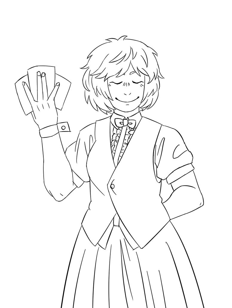 Clause has short, shaggy blonde hair, a button nose, and gray eyes. She is a curvy woman, wider than most her age, and it is clear by her build that she eats well. She wears a black vest with a red bow tie and a white shirt underneath that has puffy sleeves. She has white cuffables with black buttons on the ends on both wrists, a ruffled black skirt, white kneesocks, and brown dancing shoes.