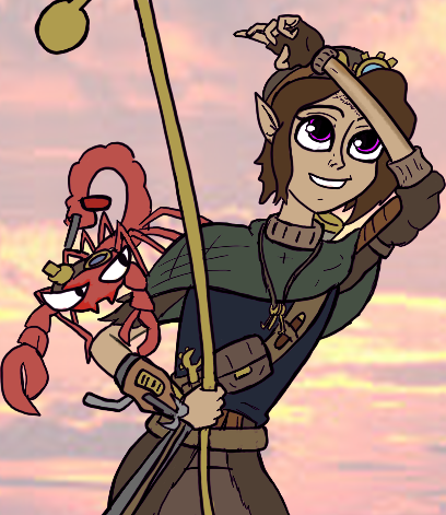 Kat is an elven child of short stature with a hispanic skin tone accompanied by her best friend Dexter. Dexter is a mad scientist trapped in the body of a 1,5 foot long red scorpion. They have both known eachother for a long period of time and are close to family to eachother (Even if Dexter wont admit it). Dexter is dangerously smart, being cabaple of making an airship engine out of raw materials while Kat is one of the best thieves alive, she learned from her father. She too knows a bit about mechanics, most of it being from Dexter. They mostly rely on eachother to complete their own tasks: Kat needs Dexter to craft gadgets to help her steal better while Dexter needs Kat to steal materials and money to buy more materials to craft new gadgets. Kat really has no interest in mechanics with her being like every other 15 year old child while Dexter never asked to be stuck with an elven child to look after.