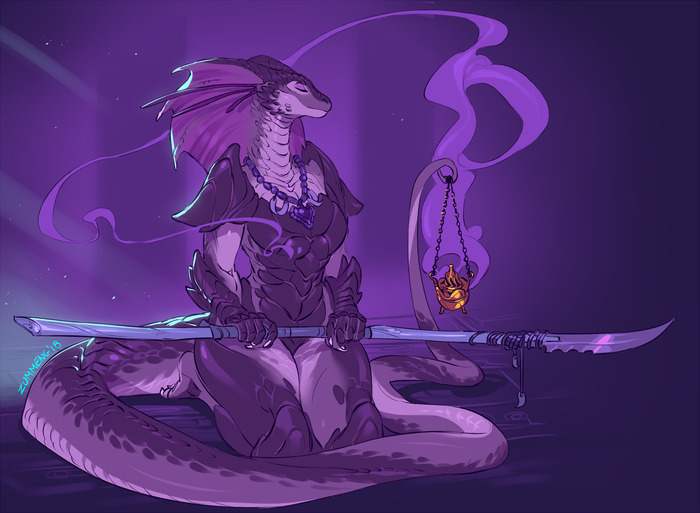 The seven foot feminine scaled being is various shades of lovely purple and lavender, her scales shaped among as clothing on her body. Though she goes naked wherever she finds herself and only wears a lovely amethyst pendant with what looked like a handmade polearm in her hand as a walking aid, pr strapped to her back. Often at her side on a belt is a censer, unlit in open company, hanging and spilling heady smoke in her home.