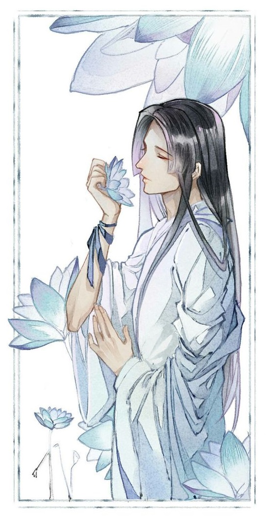 Theme: Naji no UtaAppearance and Personality:His form bears long inky black hair and pale eyes like water; his complexion fair and light. As a spirit, he has chosen to take on an appearance he believes is less threatening, standing at five feet and six inches. From the way he presents himself to his actions, he acts with gentleness. Despite all the hardships he has suffered, he has never lost his kindness. Perhaps he is one of the few truly benevolent spirits that remain in the world. His attire reflects the land of his origin: Ataiyan and Karithian robes in cool colors made of cotton and silk. Common patterns of the fabric include clouds, plants, flowers, birds, and his personal favorite–koi. When he is outdoors he is always seen with one of his painted parasols.