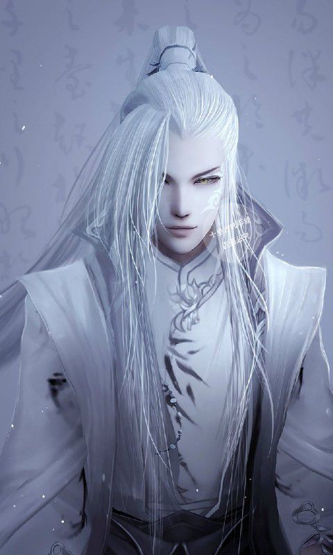 Jiang has long, straight, flowing white hair pulled up into a high ponytail. His skin is as white as snow, and as smooth as porcelain. His eyes are slender and bright yellow. He has robes made from the finest white silks, lined and trimmed with silver ice. He has boots made from sterling silver, and many bracelets and belts made from the same sterling silver only found in the mountains.