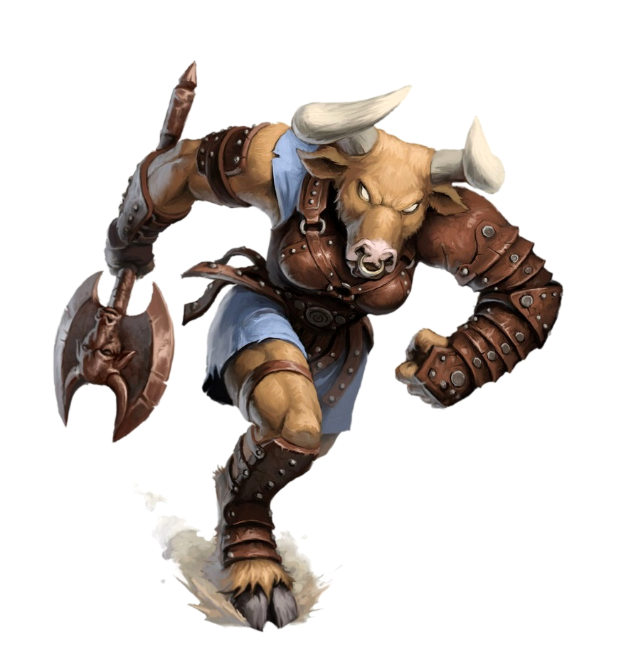 Yavish is a minotaur with light brown fur and auburn eyes. She stands at 7'2 and has a pair of horns that curve forward. As of others of her race, she possesses great physical strength and durability. Yavish has a preference for axes for their cutting ability and light armor that allows her to maneuver more freely in battle.