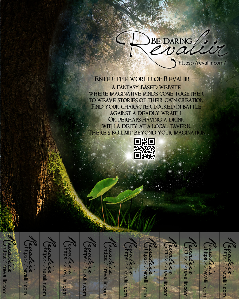 Players of Revaliir! Dwellers of the web! There are those of us who reluctantly leave our cozy nests and adventure outside (oh no the sun! -hiss-) HOWEVER we desire to lure more beings to our world. We bring this to you all! To the loyal role-players of Revaliir we give you the chance to have your designs become the poster child for us in the *real world*.
